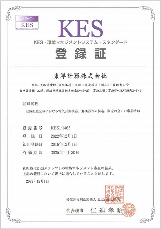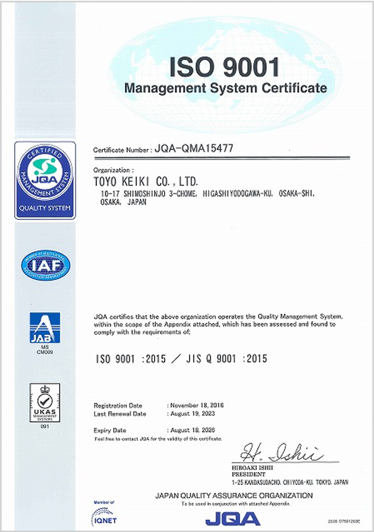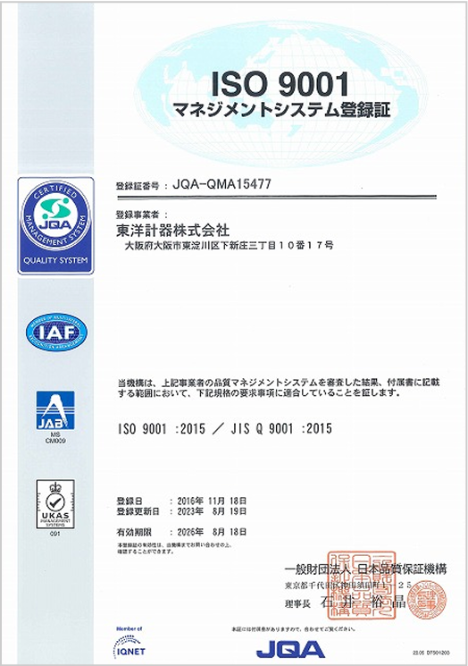 東洋計器株式会社では、国際品質保証規格であるISO9001等の認証を取得しております。